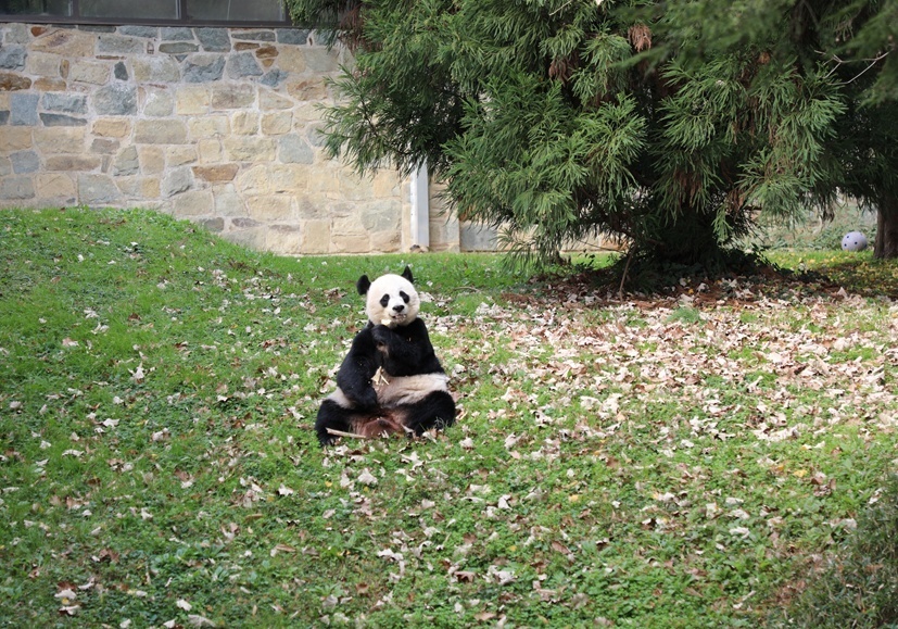 旅美大熊猫“美香”在华盛顿国家动物园的室内、室外活动空间都很大。图为“美香”在它的花园里吃东西。 李志伟摄
