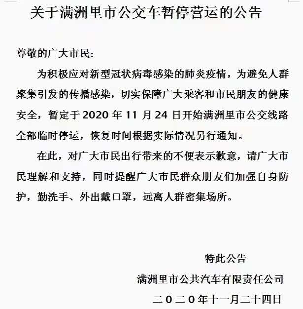 满洲里:为避免人群聚集引发疫情传播,市公交车今起暂停运营