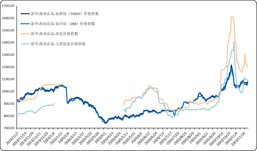 新华·海南农垦-天然橡胶系列价格指数显示,截至11月23日,标准胶(TSR20)价格指数报1077.85点,较11月16日(下同)下跌1.19%;混合胶(20#)价格指数报1067.68点,下跌1.12%。新华·海南农垦-浓乳价格指数报1194.78点,下跌1.18%;新华·海南农垦-天然胶乳价格指数报1087.89点,上涨5.16%。