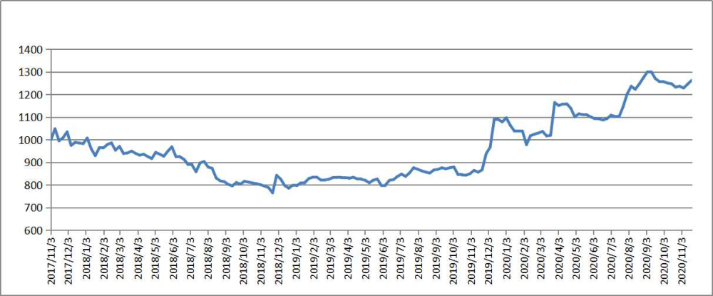 11月20日,指数报1262.09点,较上期(2020.11.9-11.15,下同)上涨16.59点,涨幅1.33%,与基期相比上涨262.09点,涨幅26.21%。