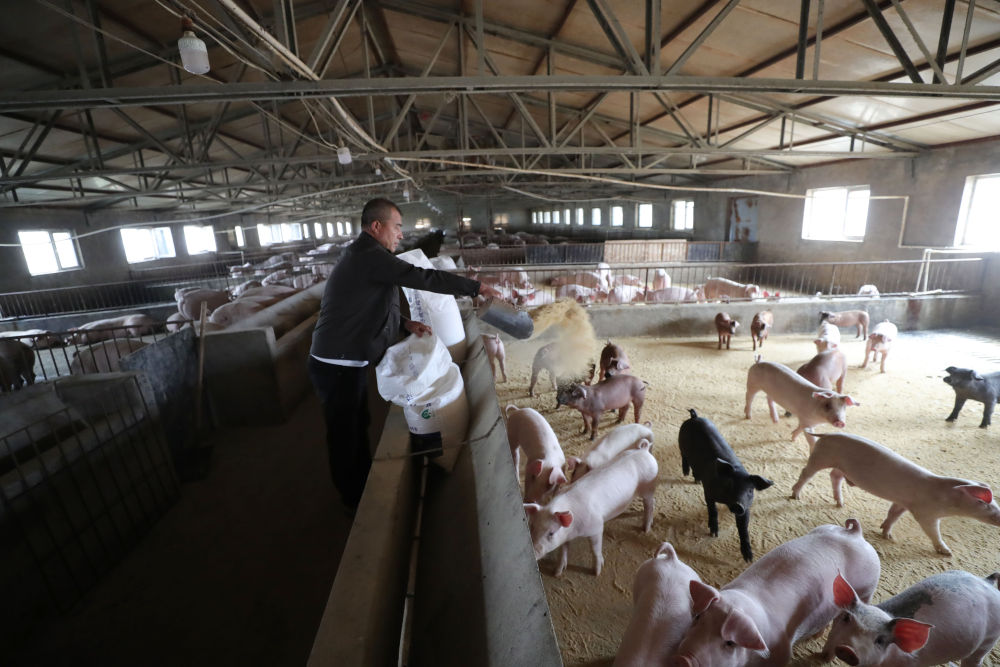 9月24日,在辽宁省开原市庆云堡镇后施家堡村,立军生猪养殖厂饲养员在给生猪投喂饲料。新华社记者 杨青 摄