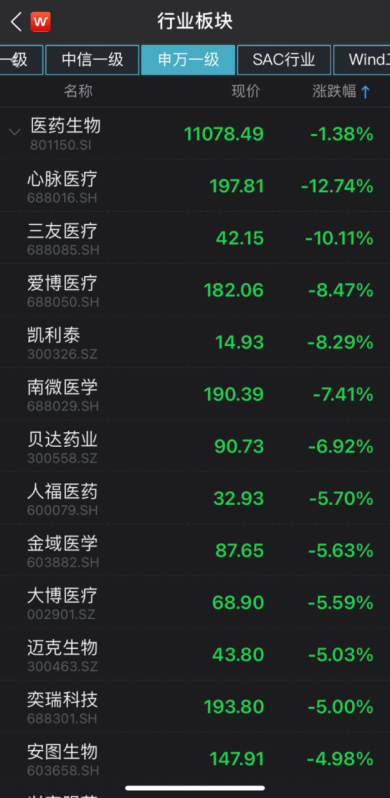 医药生物板块25日早盘重挫。据Wind数据,截至午间收盘,医药生物板块下跌1.38%,总市值半日蒸发926亿元,最新总市值为6.62万亿元。板块内,心脉医疗、三友医疗均跌逾10%。