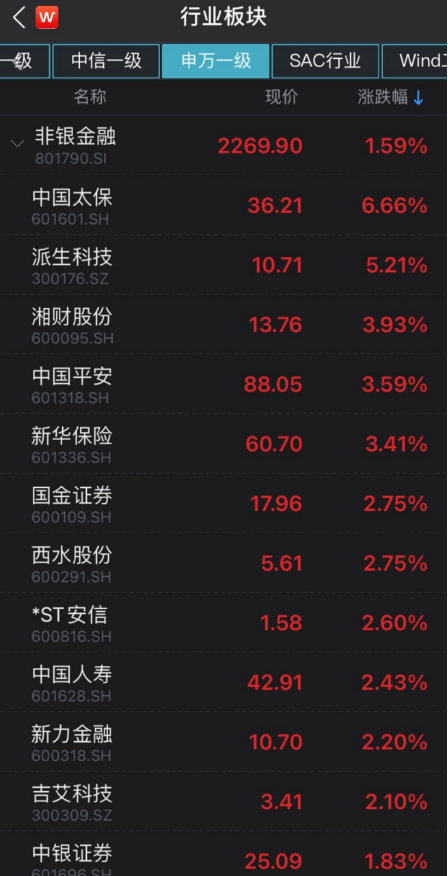 个股中,中国太保涨逾6%,派生科技涨逾5%,湘财股份、新华保险、中国平安、西水股份、中国人寿、中国人保、中银证券等均有不错涨幅。