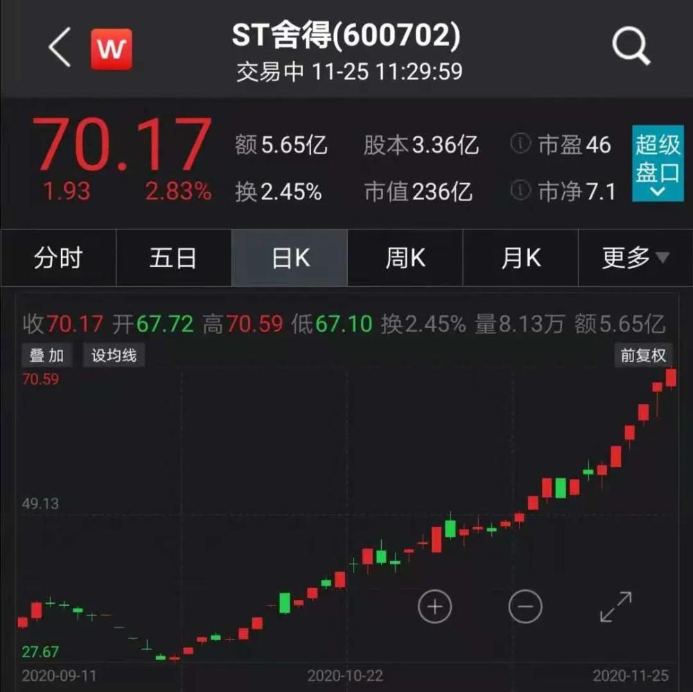 从9月28日的盘中最低价27.67元/股到11月25日的70.59元/股,不到2个月时间,ST舍得股价最大涨幅达到155%。