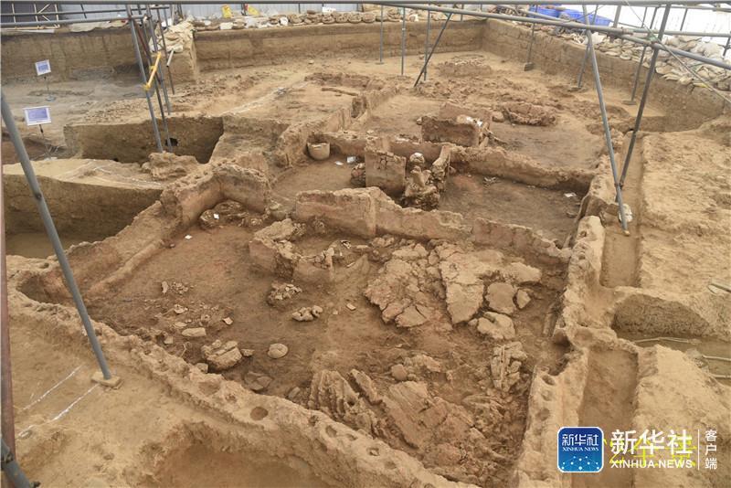 ↑图为河南南阳黄山遗址出土的仰韶文化晚期的大型玉石器生产作坊,该作坊标号为F2,面积超过120平方米(2020年8月摄)。新华社发(河南省文物考古研究院供图)