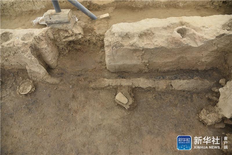 ↑河南南阳黄山遗址出土的仰韶文化晚期大型玉石器生产作坊前的推拉门滑道(2020年8月摄)。新华社发(河南省文物考古研究院供图)