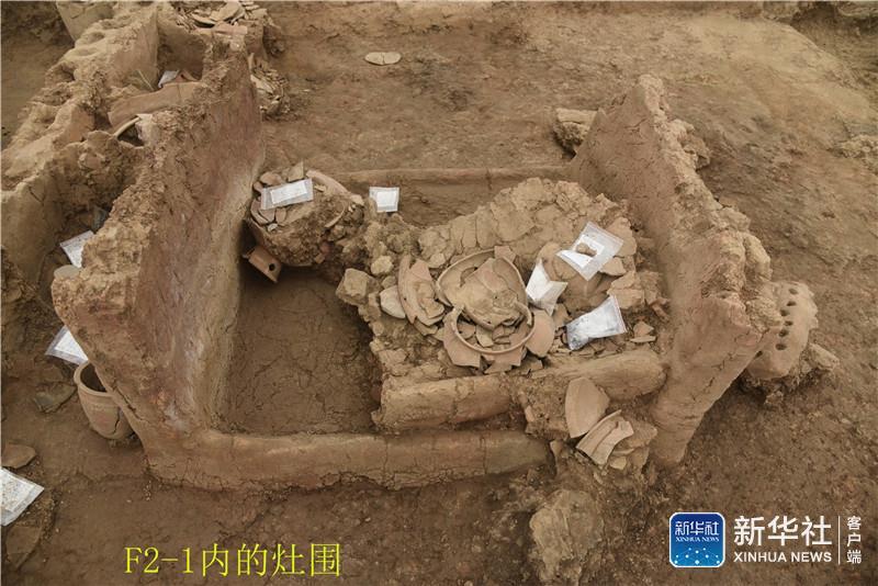 ↑河南南阳黄山遗址出土的、标号为F2的仰韶文化晚期大型玉石器生产作坊内的灶围(2020年8月摄)。新华社发(河南省文物考古研究院供图)