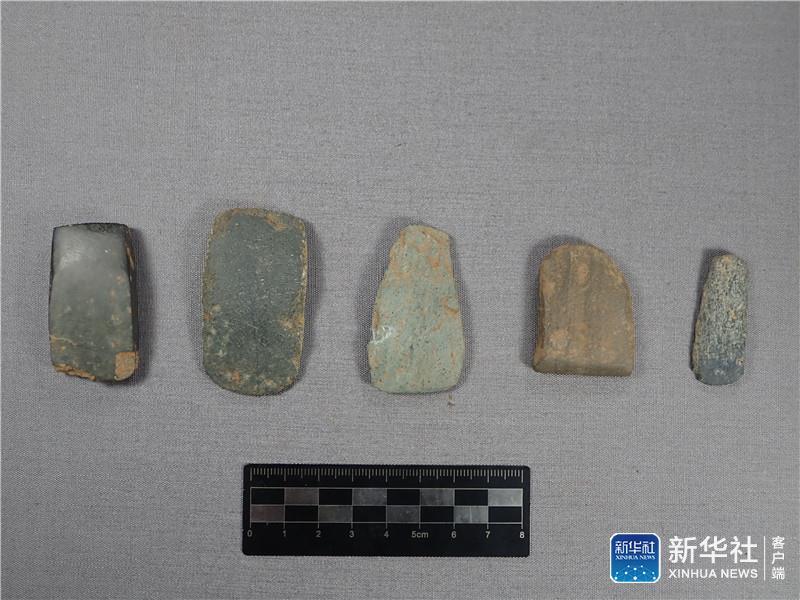 ↑河南南阳黄山遗址出土的石质制玉工具----系列石刻刀(2019年1月8日摄)。新华社发(河南省文物考古研究院供图)