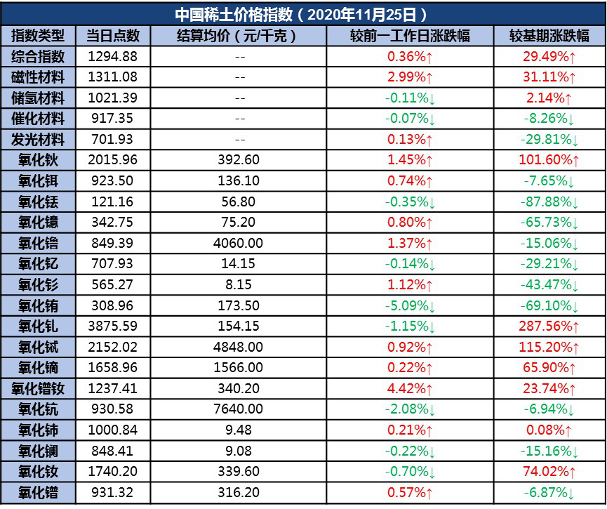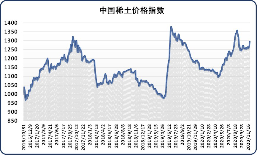 新华财经北京11月25日电(刘星麟)25日,中国稀土价格指数报1294.88点,较前一工作日上涨4.71点,涨幅为0.36%。氧化镨钕价格指数环比增幅达4.42%,上游厂商看好后市,惜售挺价,下游磁材企业谨慎观望,补库存需求仍存。