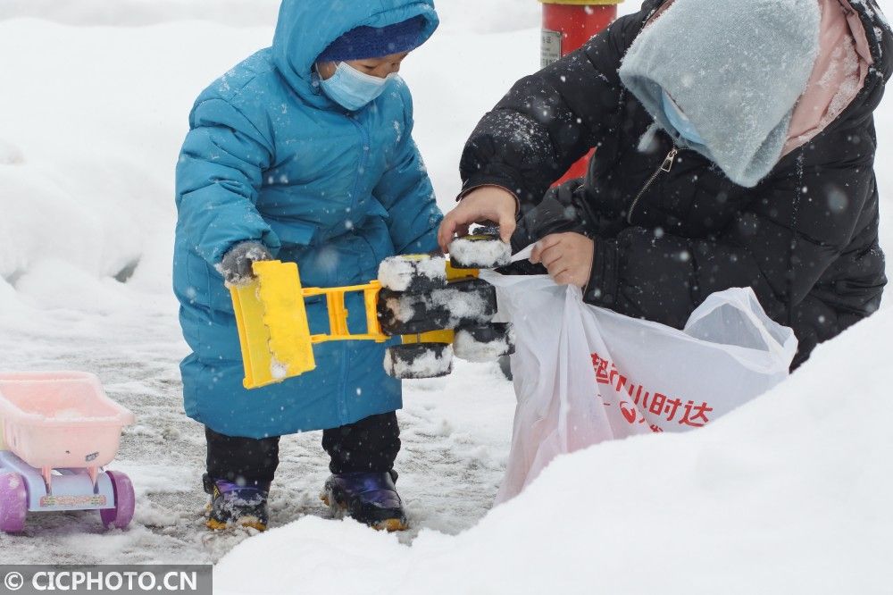 ↑2020年11月20日,黑龙江省牡丹江市爱民区新华游园,一位小朋友在家人陪伴下玩雪。CICPHOTO/张春祥 摄