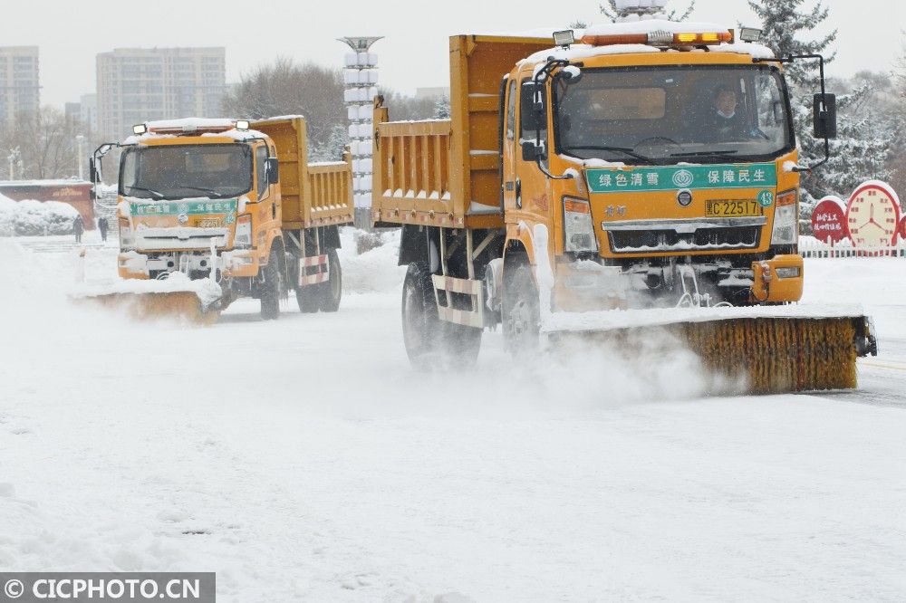 ↑2020年11月20日,黑龙江省牡丹江市光华街,工作人员在驾驶清雪车辆编组作业。CICPHOTO/张春祥 摄