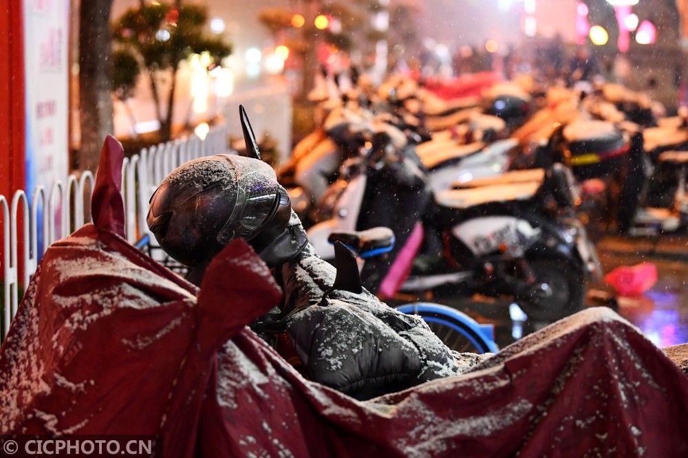 ↑2020年11月21日,甘肃省天水市,雪花落在路边的摩托车上。CICPHOTO/周文涛 摄