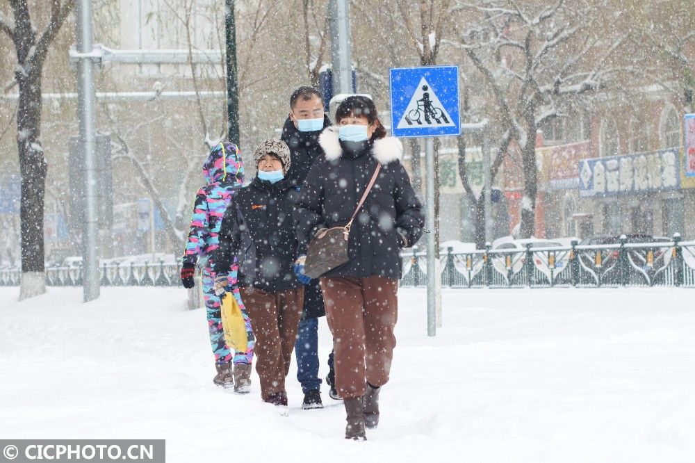 ↑2020年11月20日,市民在风雪中走过黑龙江省牡丹江市爱民区新华路。CICPHOTO/张春祥 摄