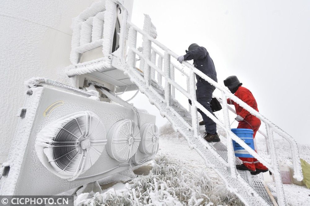↑2020年11月22日,湖北省襄阳市保康县后坪镇横冲风电场,检修人员走进风电机组,准备开展检修和除冰作业。CICPHOTO/杨韬 摄