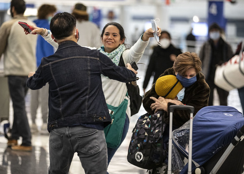 11月25日,在美国芝加哥奥黑尔国际机场,人们见面后相互拥抱。新华社发(乔尔·莱纳摄)