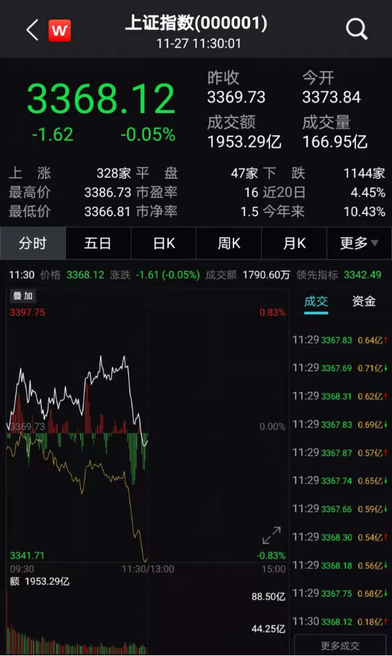 新华社北京11月27日电(中国证券报记者林倩)11月27日上午,A股三大指数盘中震荡,临近午盘跳水。截至午间收盘,上证指数下跌0.05%,深证成指下跌0.34%,创业板指下跌0.38%。Wind数据显示,两市半日成交额超4400亿元,北向资金半日净卖出5.72亿元。