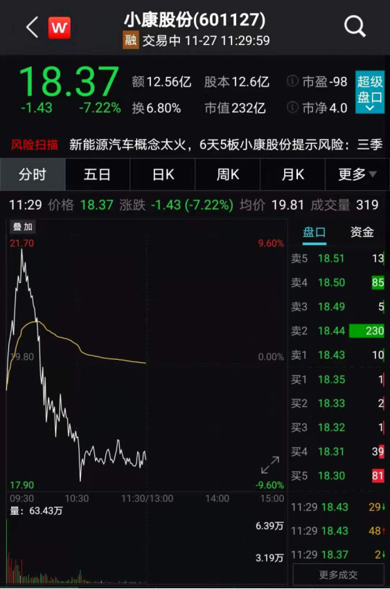 以11月26日的收盘数据来看,小康股份在11月的涨幅为126.03%,更是在8个交易日中收获7个涨停板。11月27日上午,小康股份下跌7.22%,总市值为232亿元,半日成交额为12.56亿元,换手率为6.8%。