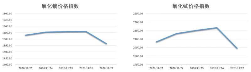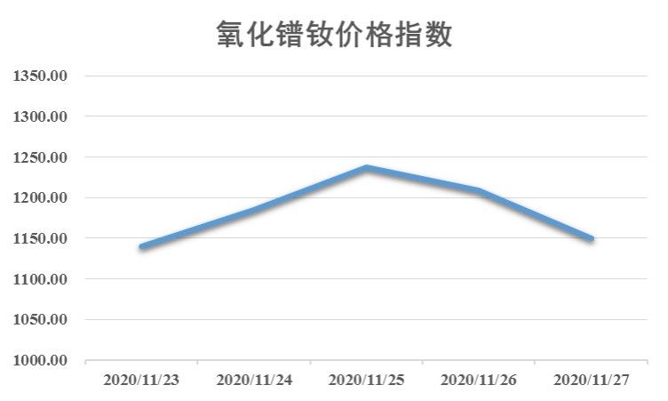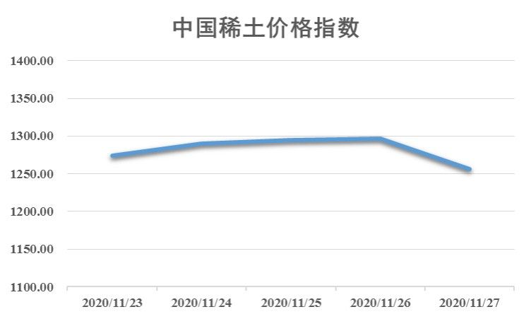 新华财经北京11月27日电(刘星麟)本周稀土市场前期价格上涨,后期价格调整回落,中国稀土价格指数略有下调,截至11月27日,中国稀土价格指数报1256.25点,较上周五(11月20日)下跌10.03点,跌幅0.79%。