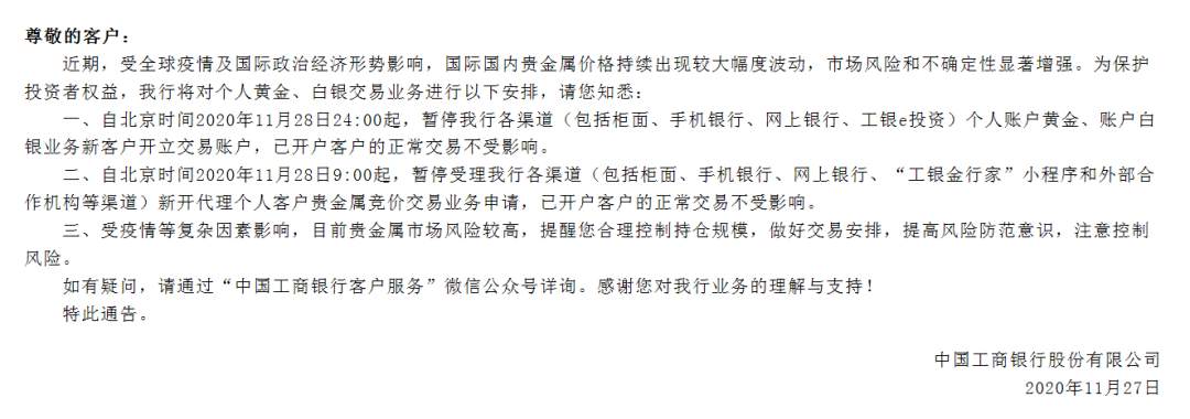 例如,工行表示,自北京时间2020年11月28日24:00起,暂停各渠道(包括柜面、手机银行、网上银行、工银e投资)个人账户黄金、账户白银业务新客户开立交易账户,已开户客户的正常交易不受影响。11月28日9:00起,暂停受理各渠道(包括柜面、手机银行、网上银行、“工银金行家”小程序和外部合作机构等渠道)新开代理个人客户贵金属竞价交易业务申请,已开户客户的正常交易不受影响。