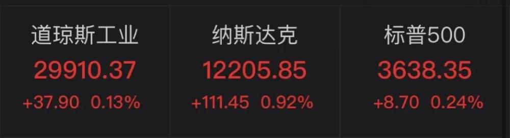 截至收盘,道指涨0.13%,报29910.37点;标普500指数涨0.24%,报3638.35点;纳指涨0.92%,报12205.85点。