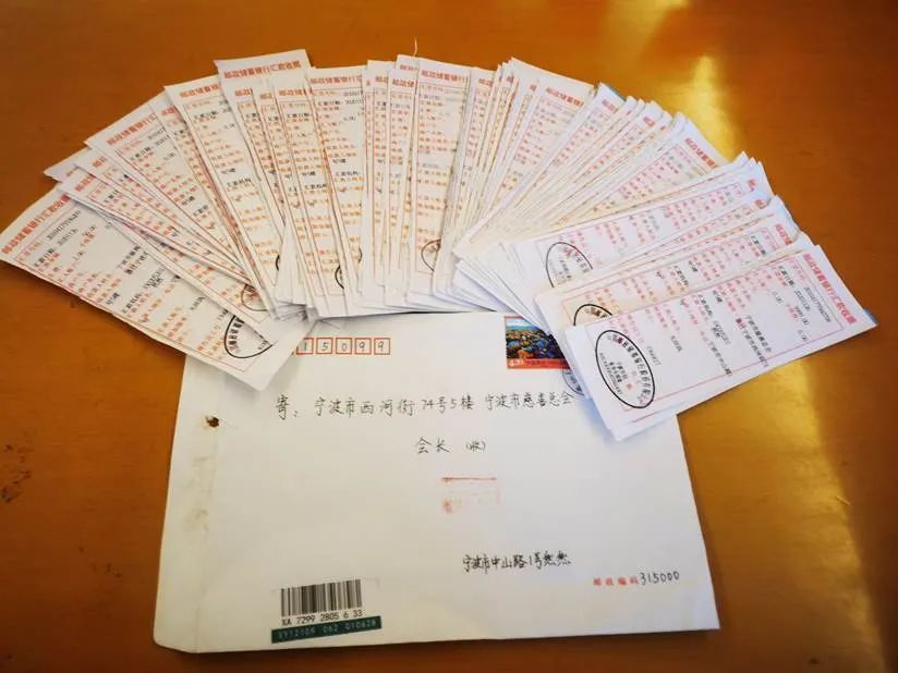 信封里依旧是一叠厚厚的汇款单,共105张,其中103张是9999元,另有一张50元,一张53元,累计103万元。善款分别从中国邮政储蓄银行宁波分行以及宁波海曙区邮政大厦营业所寄出。