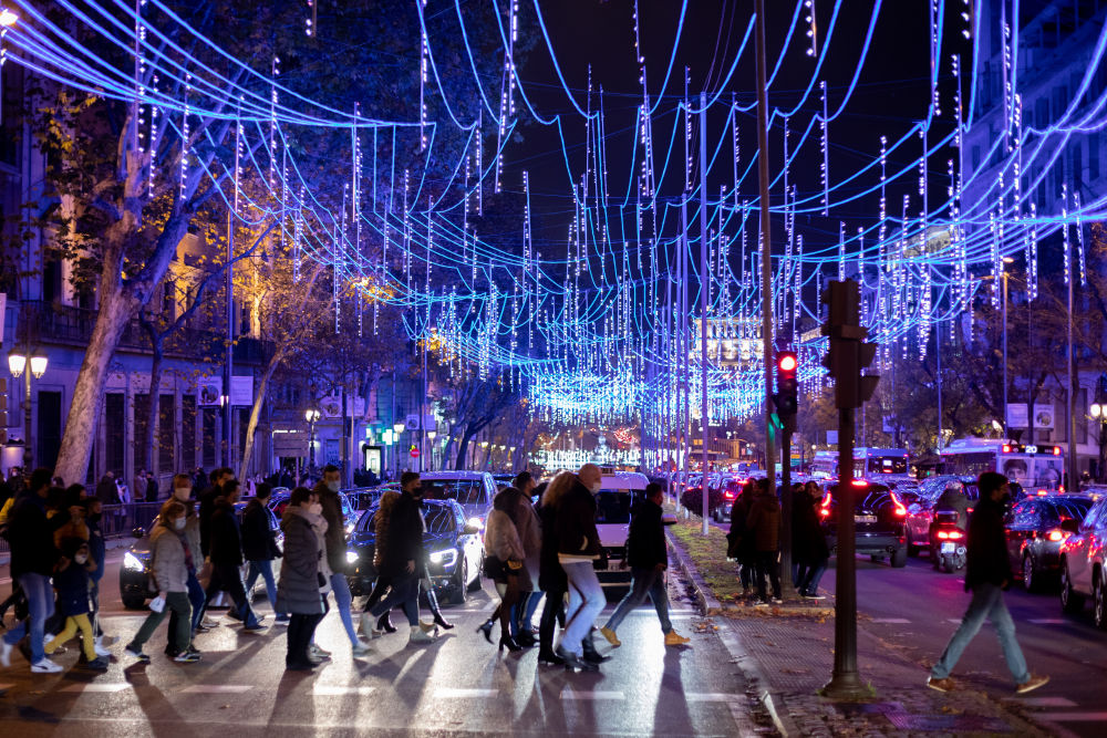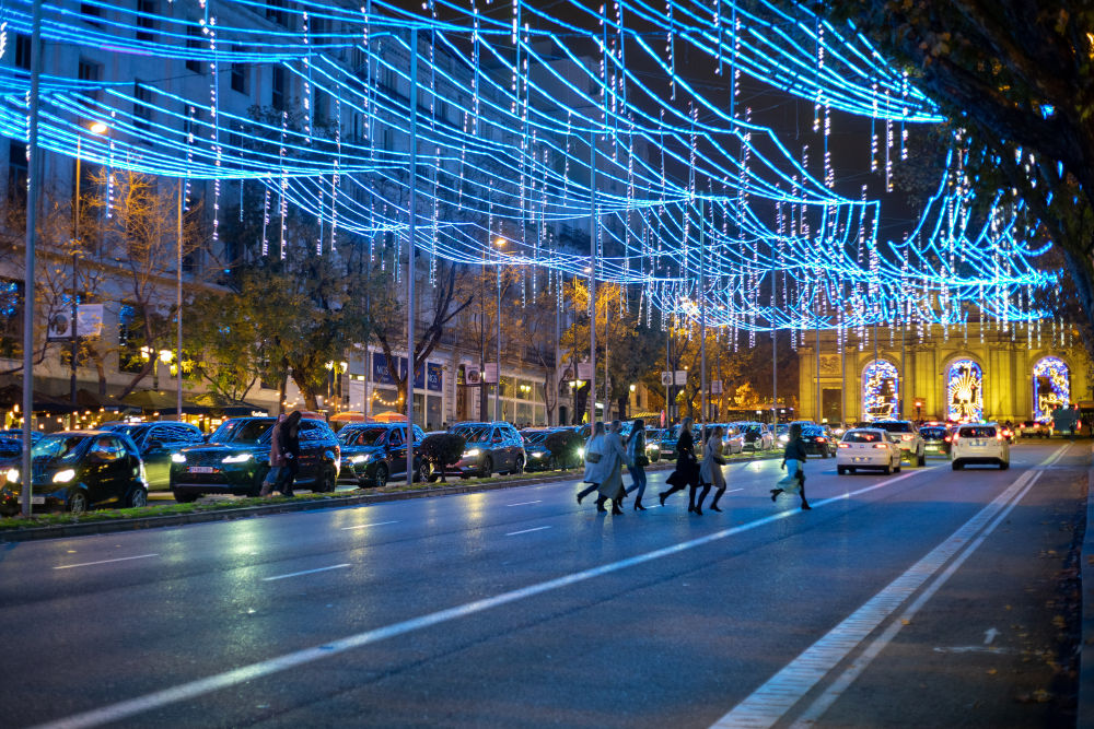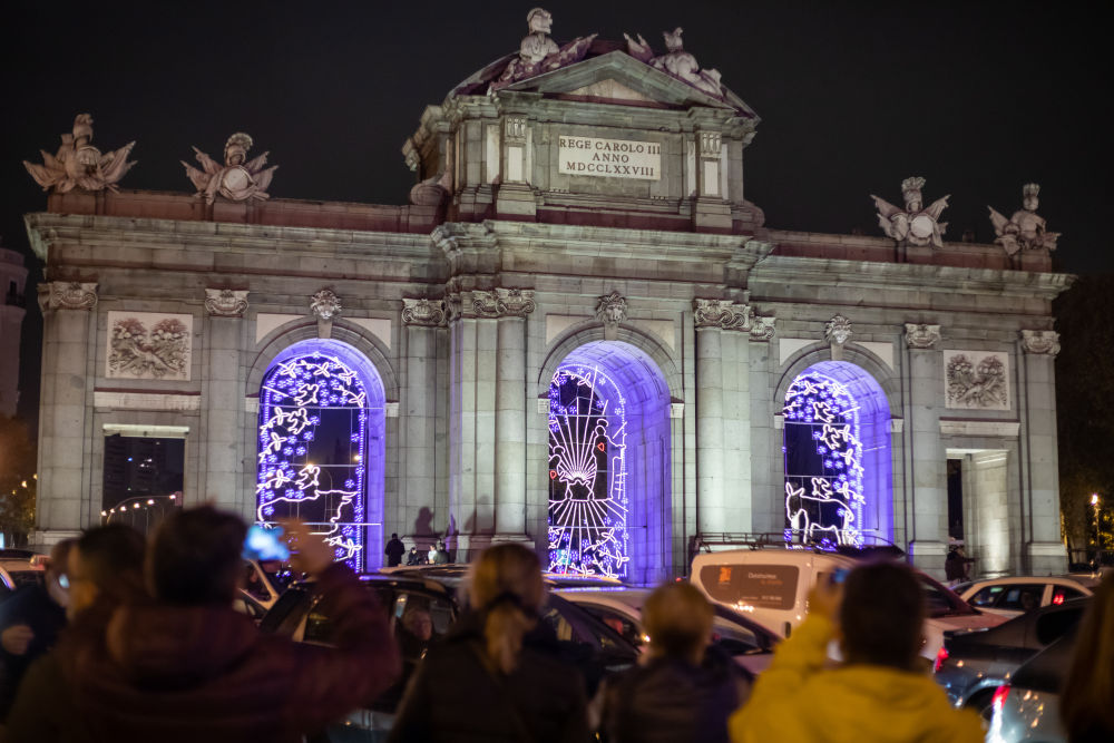 ↑11月28日,人们在西班牙马德里阿尔卡拉门观看圣诞彩灯。