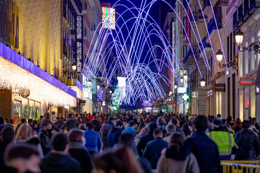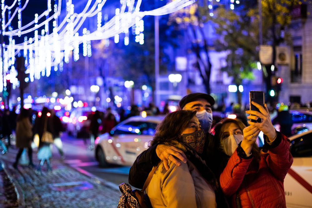 ↑11月28日,人们在悬挂有圣诞彩灯的西班牙马德里街头合影。