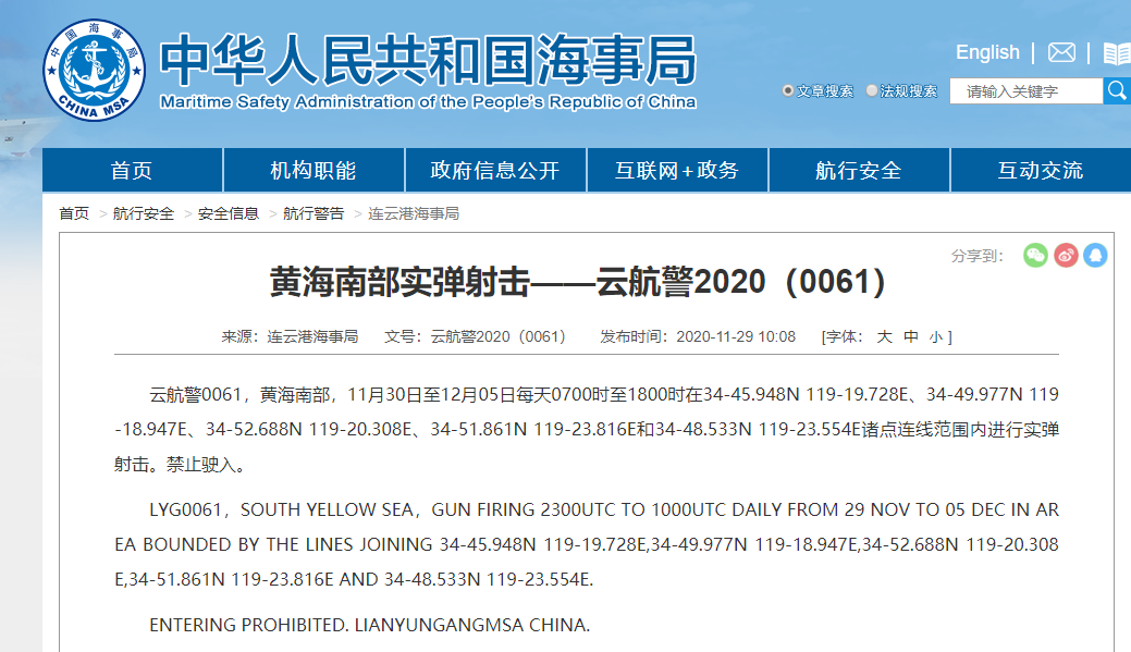 11月29日,江苏连云港海事局发布预警,黄海南部进行实弹射击,禁止驶入。
