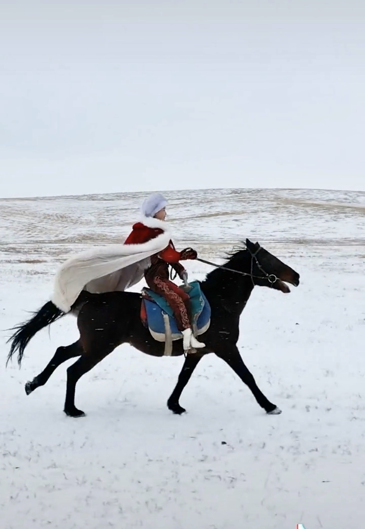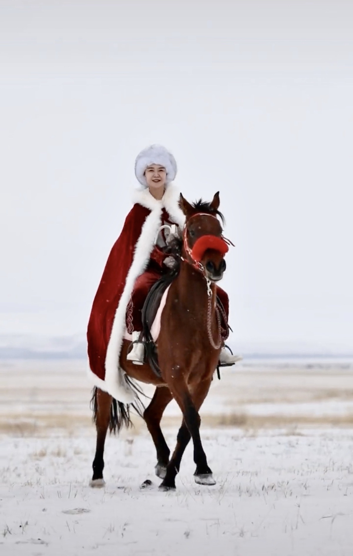 11月29日,新疆昭苏,白雪皑皑,副县长贺娇龙身披红斗篷,骑着骏马奔腾的视频刷频网络。
