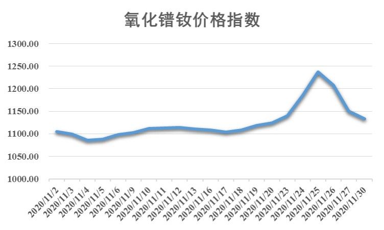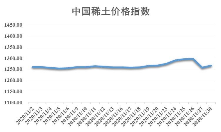 新华财经北京11月30日电(刘星麟)11月份,稀土市场波动震荡,氧化镝价格窄幅波动,氧化铽、氧化镨钕价格波动上涨。截至11月30日,中国稀土价格指数报1265.61点,较上月末(10月30日)上涨9.96点,涨幅为0.79%。