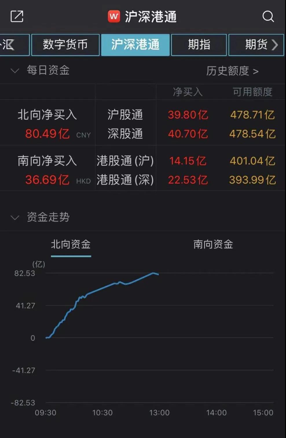 从资金面看,Wind数据显示,截至午间收盘,北向资金净流入80.49亿元,其中沪股通资金净流入39.80亿元、深股通资金净流入40.70亿元。
