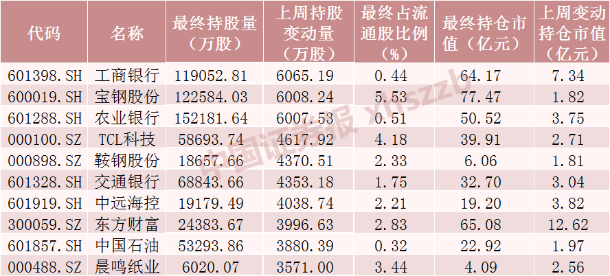 上周北向资金累计净流入168.50亿元。Choice数据显示,截至11月27日,北向资金持仓市值为2.10万亿元,上周共加仓678只股票,其中对53只股票的加仓超过1000万股,对银行股的加仓尤其明显。工商银行、宝钢股份、农业银行分别被加仓6065.192万股、6008.24万股、6007.53万股。此外,TCL科技、鞍钢股份、交通银行、中远海控均被加仓超4000万股。