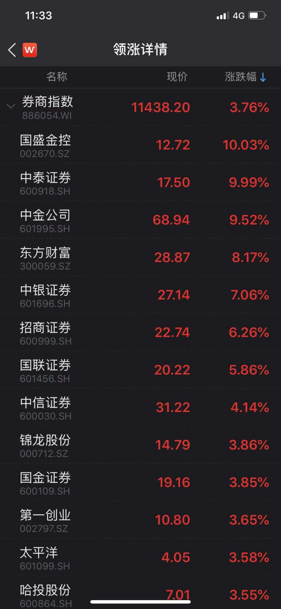 券商股爆发。截至午间收盘,Wind券商指数上涨3.76%,板块内股票全线上涨,国盛金控、中泰证券涨停,涨停板上的封单分别达13.2万手、20.9万手。算上上午的涨停,国盛金控已连续3个交易日涨停。此外,中金公司涨逾9%,东方财富涨逾8%。