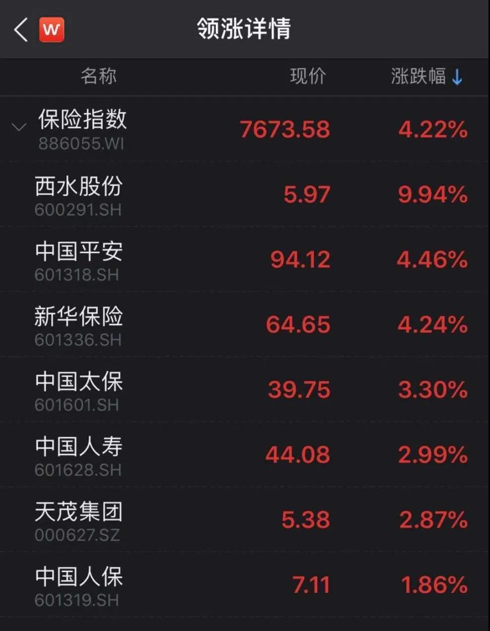 “金融三剑客”之一的保险板块也大涨。截至午间收盘,保险股全线上涨,西水股份涨停,中国平安、新华保险涨逾4%。