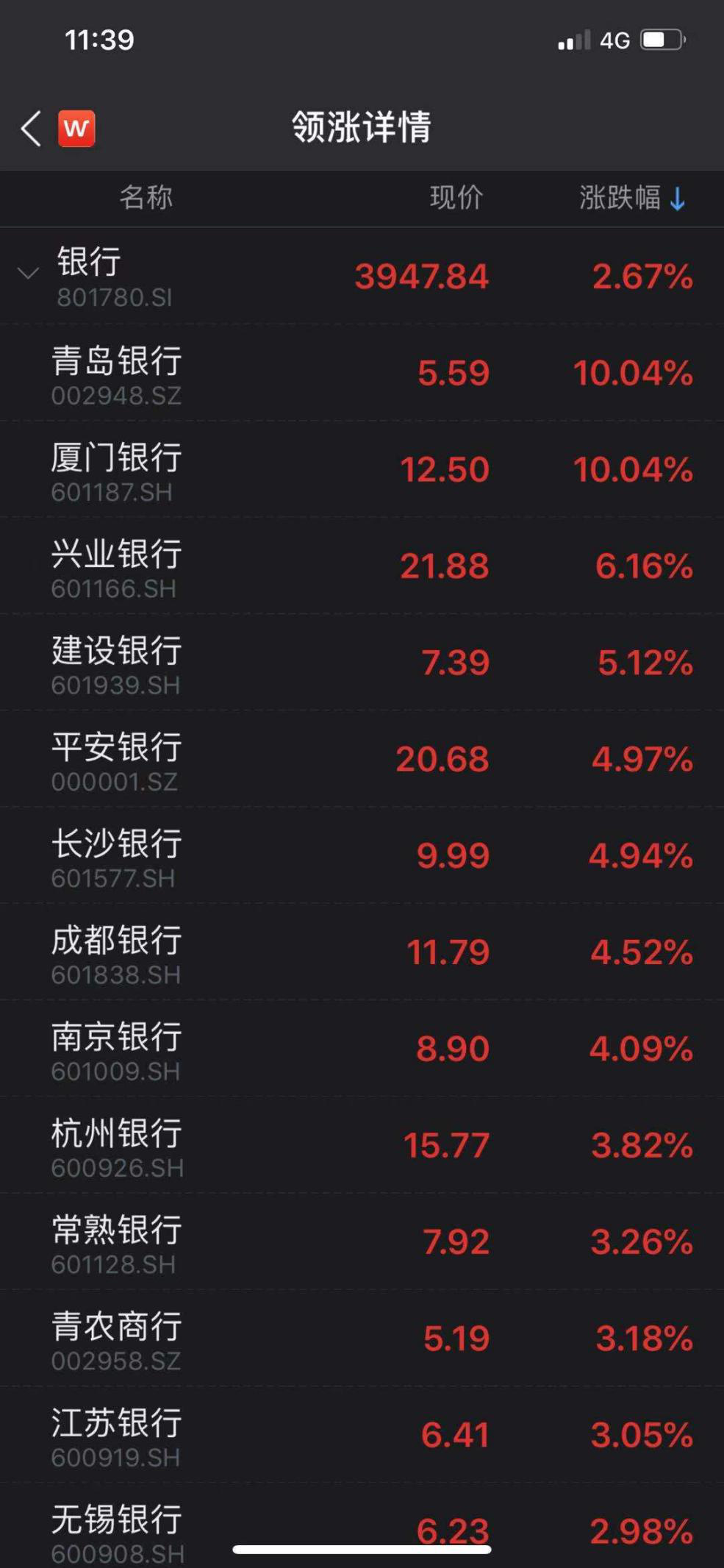 “金融三剑客”中体量最大的银行板块再度走强。截至午间收盘,申万一级行业中,银行股除中信银行外全线上涨,厦门银行、青岛银行涨停,兴业银行涨逾6%,建设银行涨逾5%,平安银行、长沙银行、成都银行等涨逾4%。