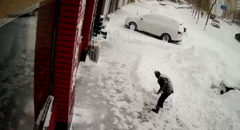 直到有一天下起了大雪,饭店前面也堆积起很厚的一层雪,清晨8点多,老板还没有来开门。那位拾荒老人拿着工具,在店门口为她铲出了一条路。
