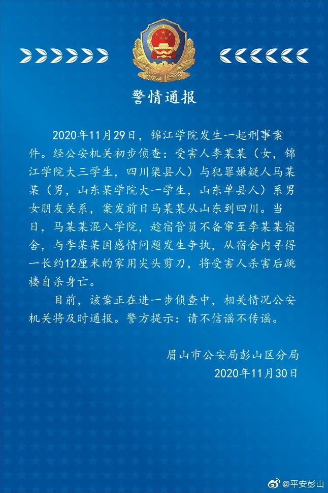 30日上午,彭山警方通报案件详情:经初步侦查,犯罪嫌疑人马某某(男,山东某学院大一学生)窜至受害人李某某(女,锦江学院大三学生)宿舍,两人因感情问题发生争执,马某某将李某某杀害后跳楼自杀身亡。
