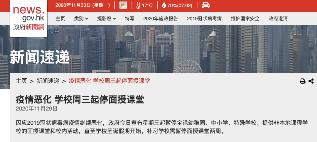 香港特区政府官网发布新闻公报宣布,由于新冠肺炎疫情继续恶化,将在本星期三(12月2日)暂停全港幼稚园及中小学(包括特殊学校及提供非本地课程学校)的面授课堂及校内活动,直至学校的圣诞假期开始。至于提供非正规课程的私立学校(一般称为补习学校)则暂停面授课堂两星期。