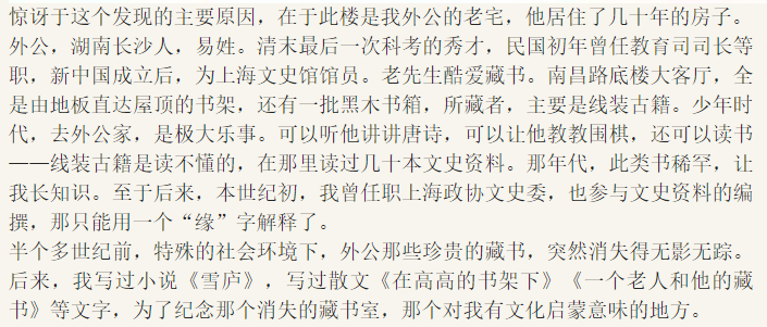 孙颙陆陆续续的作品《雪庐》、散文《在高高的书架下》《一个老人和他的藏书》,是他在以文字纪念外祖父和那间消失的藏书室。