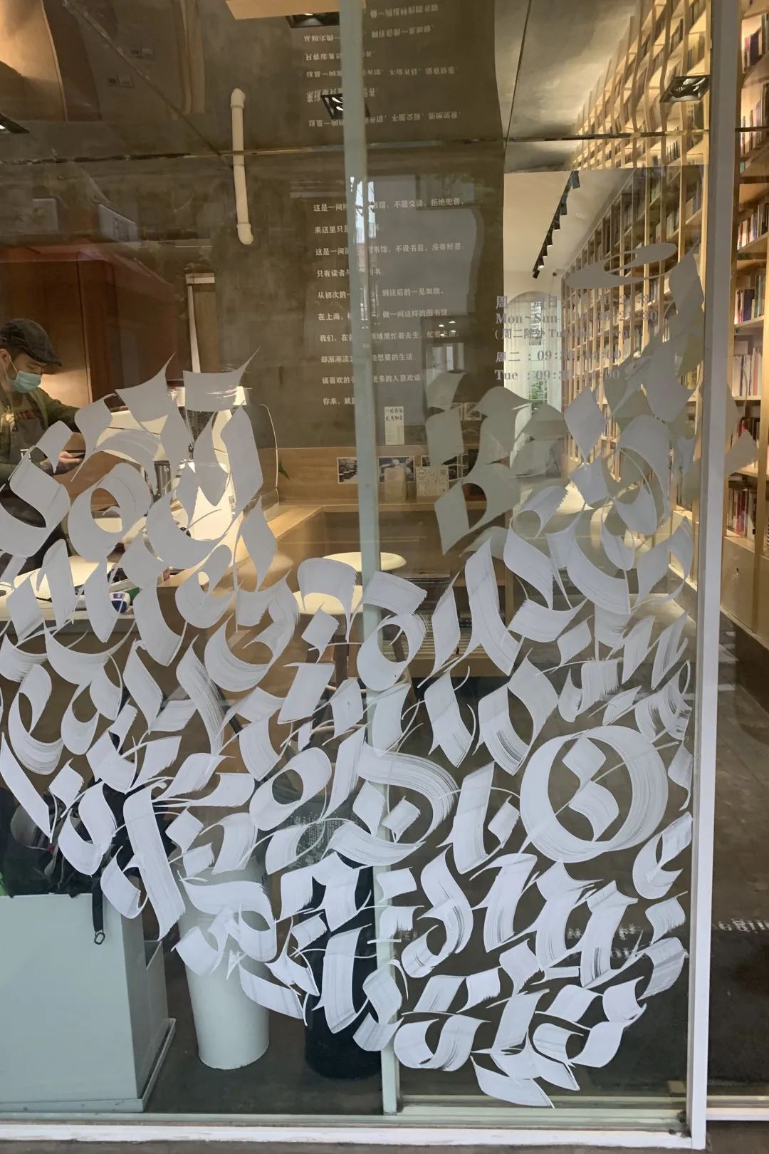 玻璃门上正埋伏着一个小心机。当门关上,玻璃上的西文书法图案分明是一本打开的书,而当门合上之际,书的图案恰好填补了一颗“心”的空白。