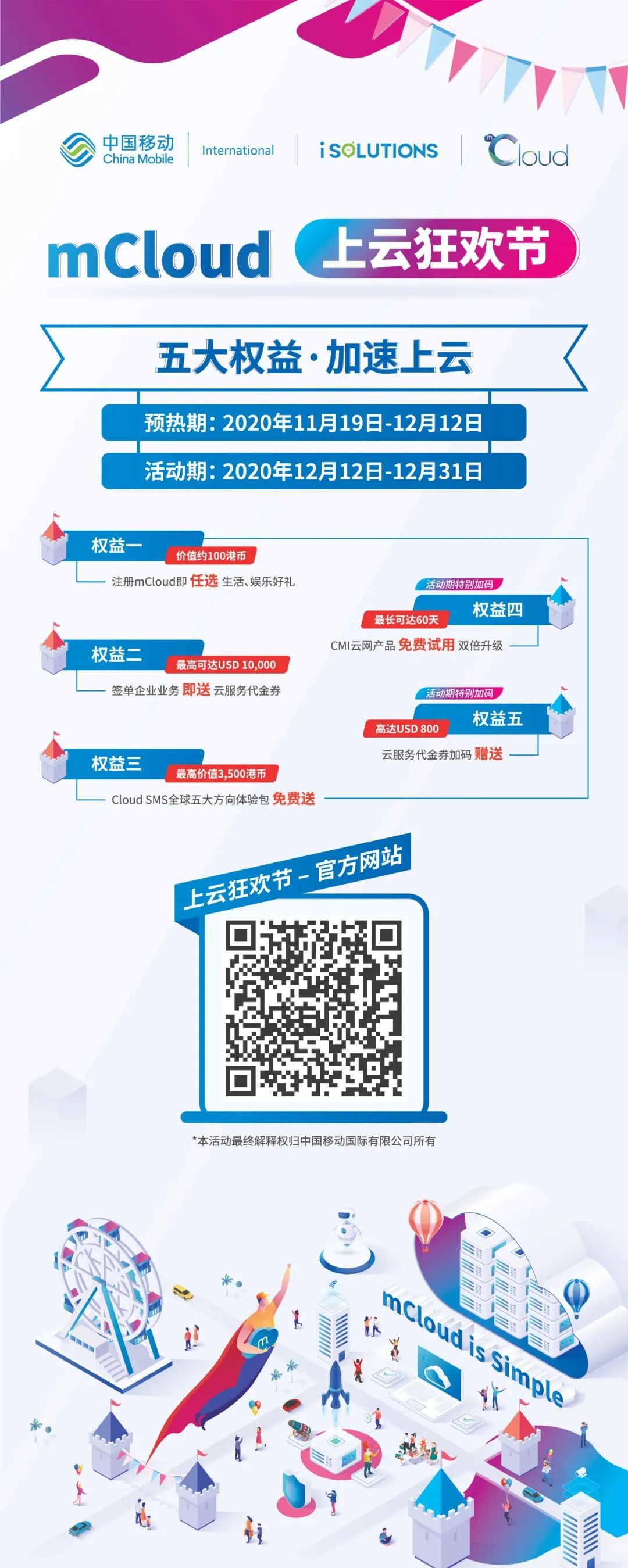 为助力更多企业客户云化转型,抢占先机,CMI 将于12月12日举办首届mCloud上云狂欢节,借助自身庞大的资源和全球合作伙伴网络,汇集mCloud生态系统下众多丰富、优惠、优质的CMI云网络解决方案,化繁为简,为客户提供一站式购物体验。上云狂欢节预热活动现已开启,客户只要注册mCloud并申请服务体验,即可享受丰富礼品权益及免费试用各类云上服务。