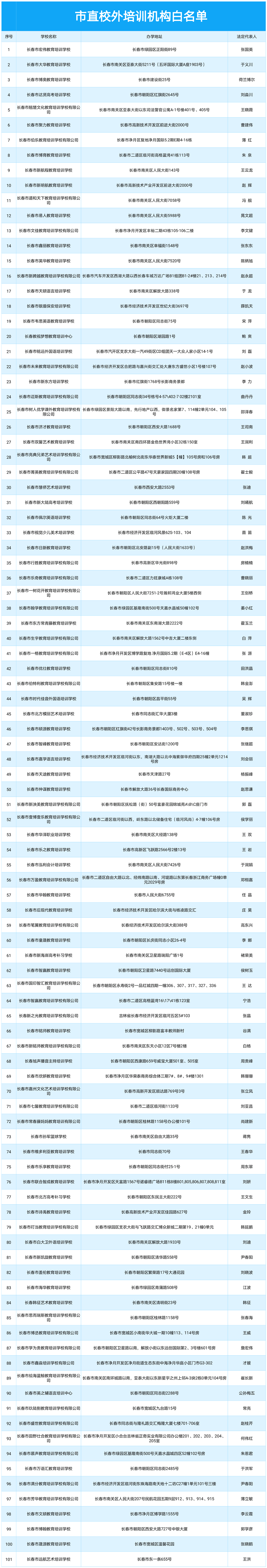 本次公布的白名单是指:经长春市教育局审批成立并在市场监督管理部门或民政部门登记,并参加2019年度年审年检的校外培训机构。本名单实行动态管理,请各位家长谨慎、理性选择校外培训机构,签订正规的校外培训服务合同,保护自身合法权益,科学认识并切实减轻中小学生课外负担;请各校外培训机构增强社会责任,强化自我约束,树立良好社会形象。