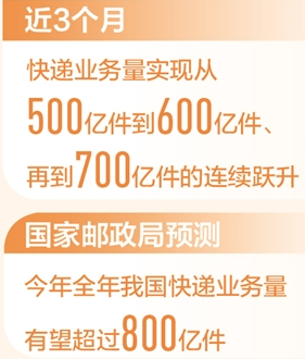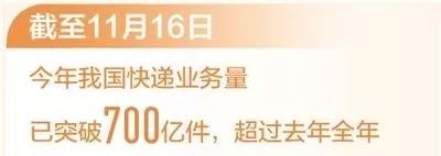 国家邮政局监测数据显示,截至11月16日,今年我国快递业务量已超700亿件,超过去年全年。近3个月,快递业务量实现从500亿件到600亿件、再到700亿件的连续跃升。