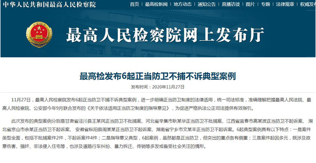 光明网评论员:上周末(11月27日),最高检发布了对6起防卫行为人不捕不诉的典型案例,旨在进一步明确正当防卫制度的法律适用,统一司法标准,准确理解把握最高法、最高检和公安部于今年9月联合发布的《关于依法适用正当防卫制度的指导意见》。这6起被认定为正当防卫而不捕不诉的典型案例,是对防卫行为的正向司法激励,也是社会秩序和正义价值形成的明确导向。