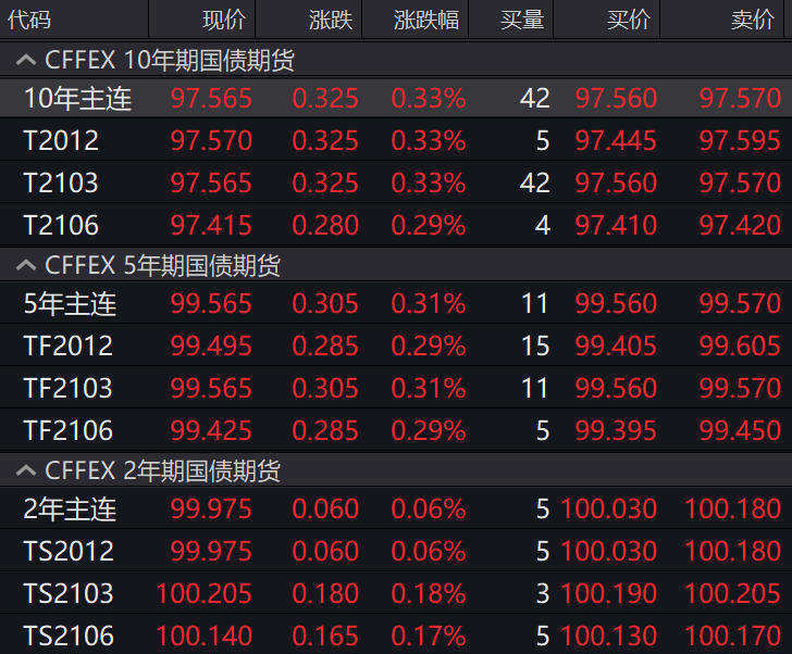 债券市场方面,国债期货应声上涨,上午全线收高。其中,10年期国债期货大涨0.3%。现券市场上,截至11:30,10年期国债活跃券成交利率大幅下行逾3BP,重回3.3%以内。