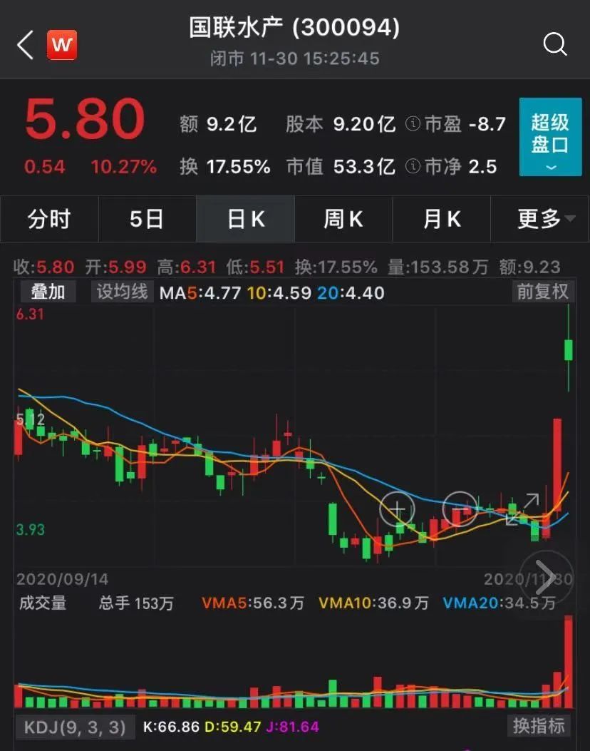 国联水产股价今日高开低走。继上周五收获20%涨停后,国联水产今日早盘高开,一度封死涨停,随后股价跳水,收涨10.27%。