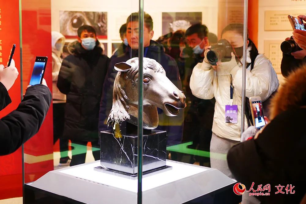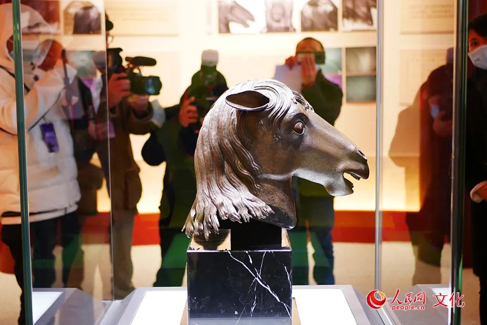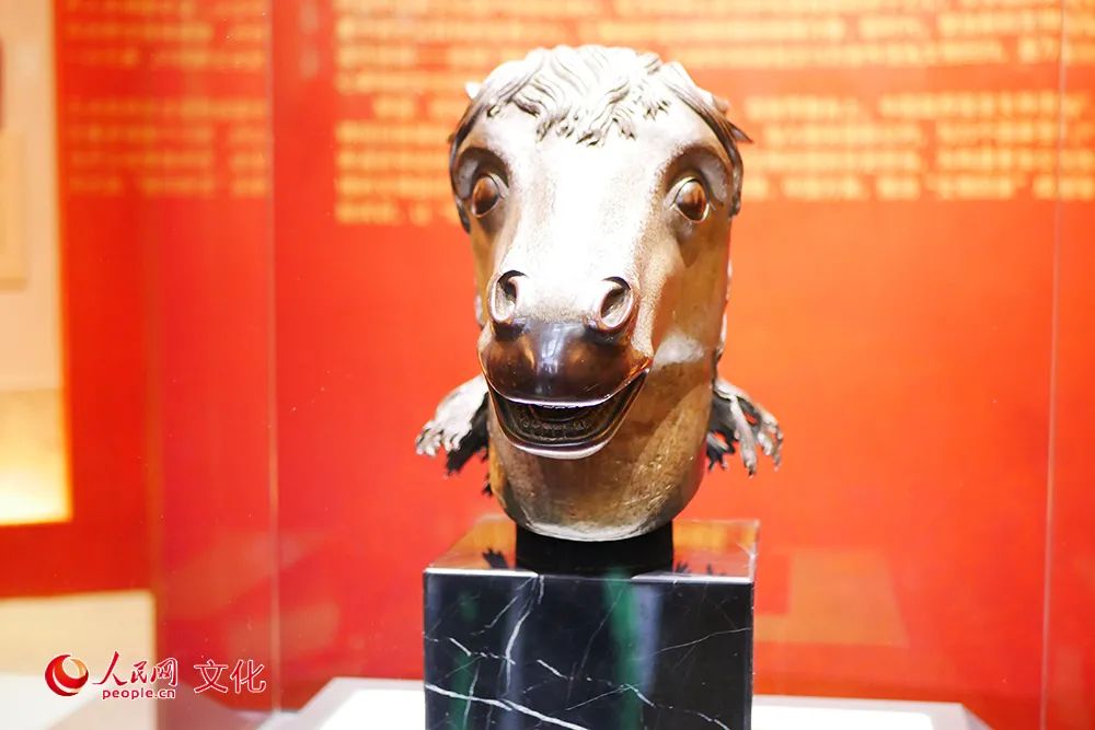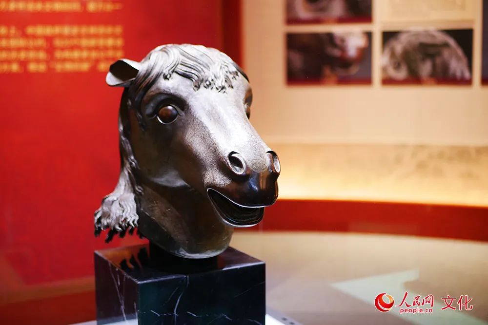 在圆明园展出的马首铜像。人民网 韦衍行摄