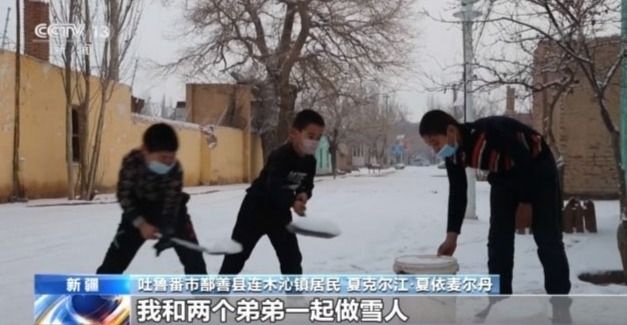 新疆吐鲁番市鄯善县连木沁镇居民 夏克尔江·夏依麦尔丹:今天早晨我起床看到雪非常高兴,我和两个弟弟一起做雪人,虽然天气有点冷,但是我们不想回去。