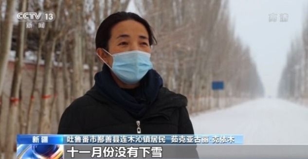 新疆吐鲁番市鄯善县连木沁镇居民 茹克亚古丽·克依木:已经有十多年了吧,十一月份没有下雪,今天我一起床就看到雪非常的激动。