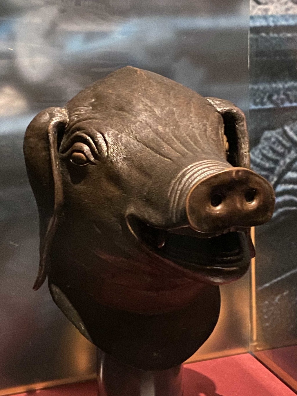 兽首展厅位于博物馆的右侧,猪首、猴首、虎首和牛首从自左至右一字排开,展台的北京墙上是圆明园海晏堂喷泉的巨幅画作,12个兽首人身像按十二生肖的排序在喷泉池两侧交错排列。